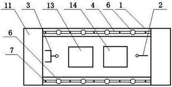 噴塑粉末回收裝置11為能夠?qū)娝芊勰┻M行回收的設備;由于傳送帶4呈矩形設置在機架1上,氣槍3和噴槍2設置在傳送帶4的相對兩側(cè),其中傳送帶4的另外相對兩側(cè)為待噴塑設備16的上料區(qū)和下料區(qū)(人員把待噴塑設備16放置在傳送帶4上和從傳送帶4上拿下),底座6和蓋體15兩者配合使用(待噴塑設備16放置在底座6和蓋體15之間,對待噴塑設備16側(cè)面的噴塑,防止塑粉從待噴塑設備16上下兩端口進入),底座6上放置有待噴塑設備16時,蓋體15放置在待噴塑設備16上,當?shù)鬃?上沒有放置待噴塑設備16時,蓋體15放置在支撐柱7上(支撐柱7通過蓋體15上的圓孔進行支撐固定)。