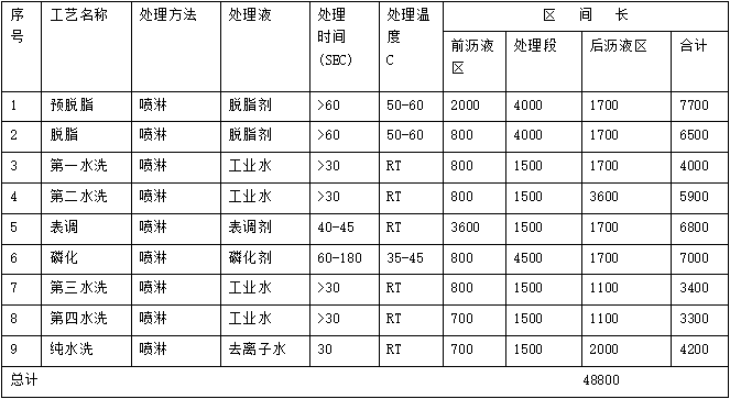 1.預(yù)脫脂、2.脫脂、3.第一次水洗、4.第二次水洗、5.表調(diào)、6.磷化、7.第三次水洗、8.第四次水洗、9.純水洗、10.靜電噴塑、11.固化